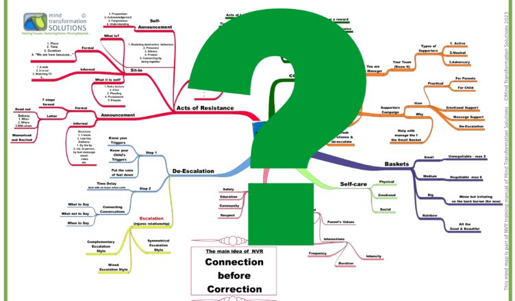 For me this is a beauty of NVR – as long as you are faithful to the principal your methods could vary. In one case, de-escalation is about staying in the room with the child who is becoming out her own control. In another case, leaving the room and putting distance between the child and the parent will deflate the confrontation. In yet another situation breaking the silence, letting people know about the violence, the struggle the impossibility of the situation will cause de-escalation in the long term.